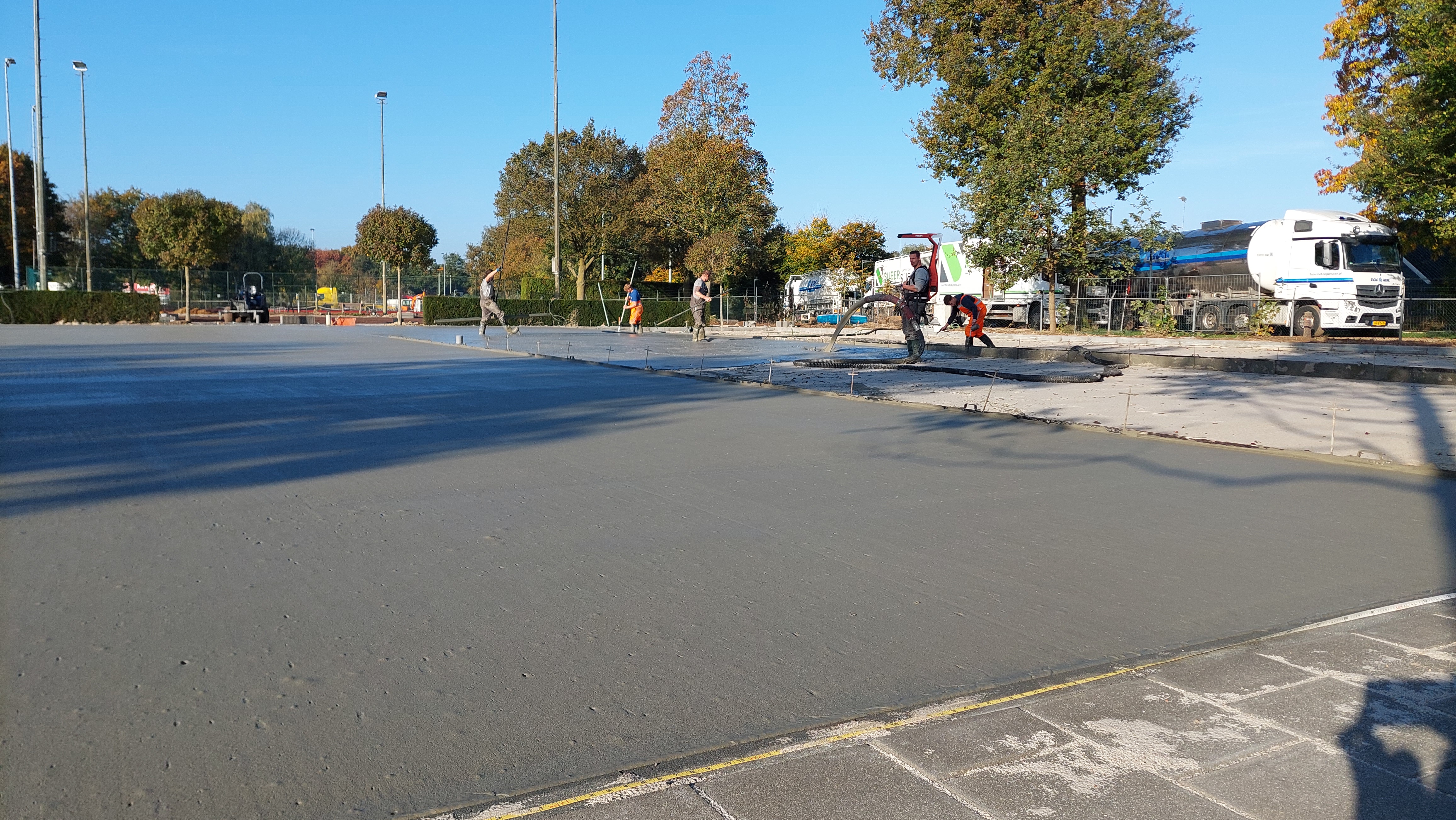 Het beton moet nu 2 à 3 weken uitharden voordat we verder kunnen met een ringfundering in de huidige vloer. De ringfundering dient als ondersteuning voor de padelkooien.